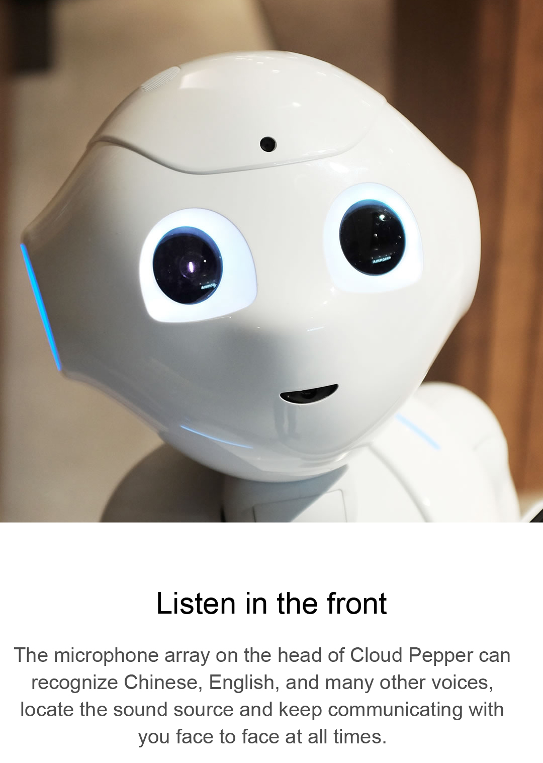 The microphone array on the head of Cloud Pepper can recognize Chinese, English, and many other voices,