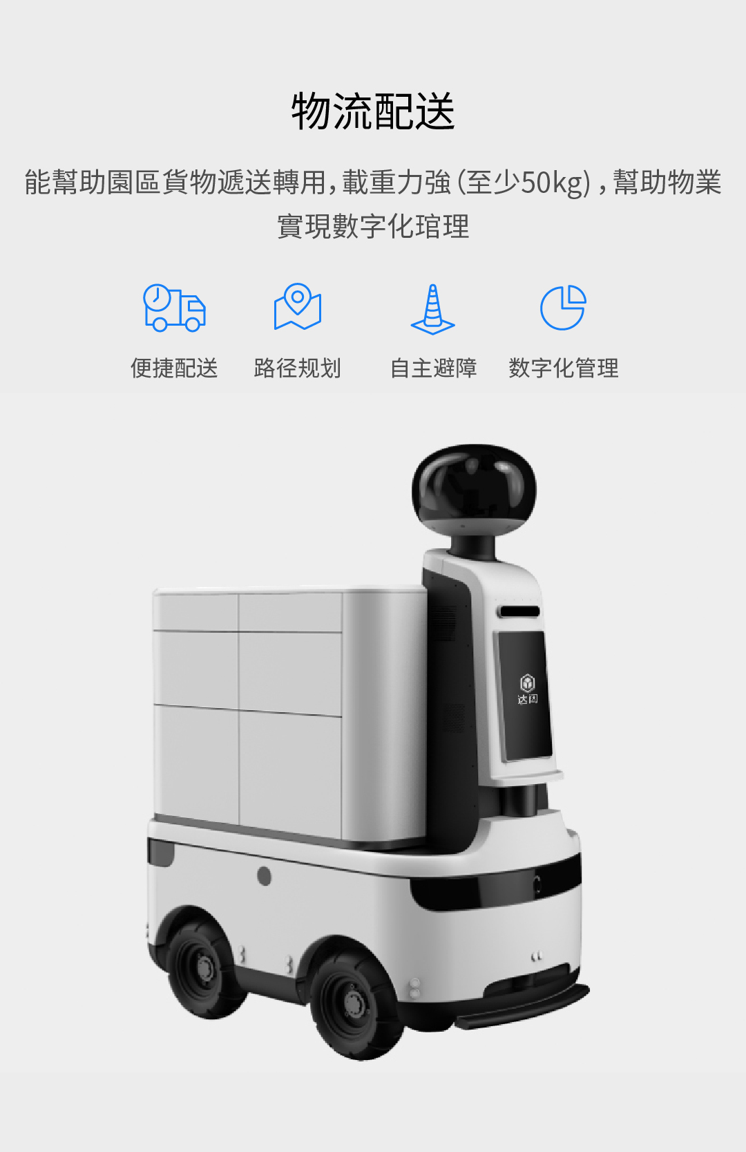 能幫助園區(qū)貨物遞送轉用,載重力強(至少50kg) ,幫助物業(yè)實現(xiàn)數(shù)字化琯理