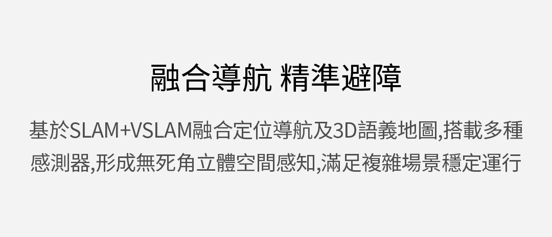 基於SLAM+VSLAM融合定位導(dǎo)航及3D語義地圖,搭載多種感測(cè)器,形成無死角立體空間感知,滿足複雜場(chǎng)景穩(wěn)定運(yùn)行