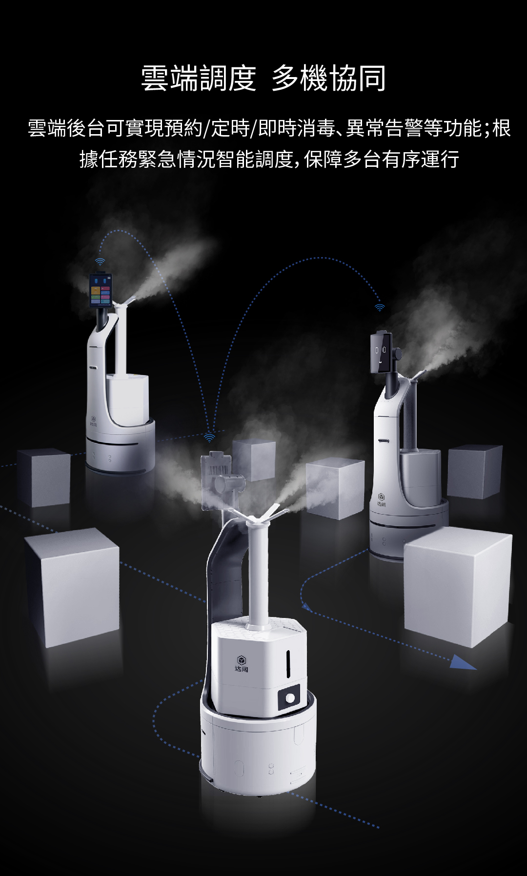 雲(yún)端後臺(tái)可實(shí)現(xiàn)預(yù)約/定時(shí)/即時(shí)消毒、異常告警等功能;根據(jù)任務(wù)緊急情況智能調(diào)度,保障多臺(tái)有序運(yùn)行