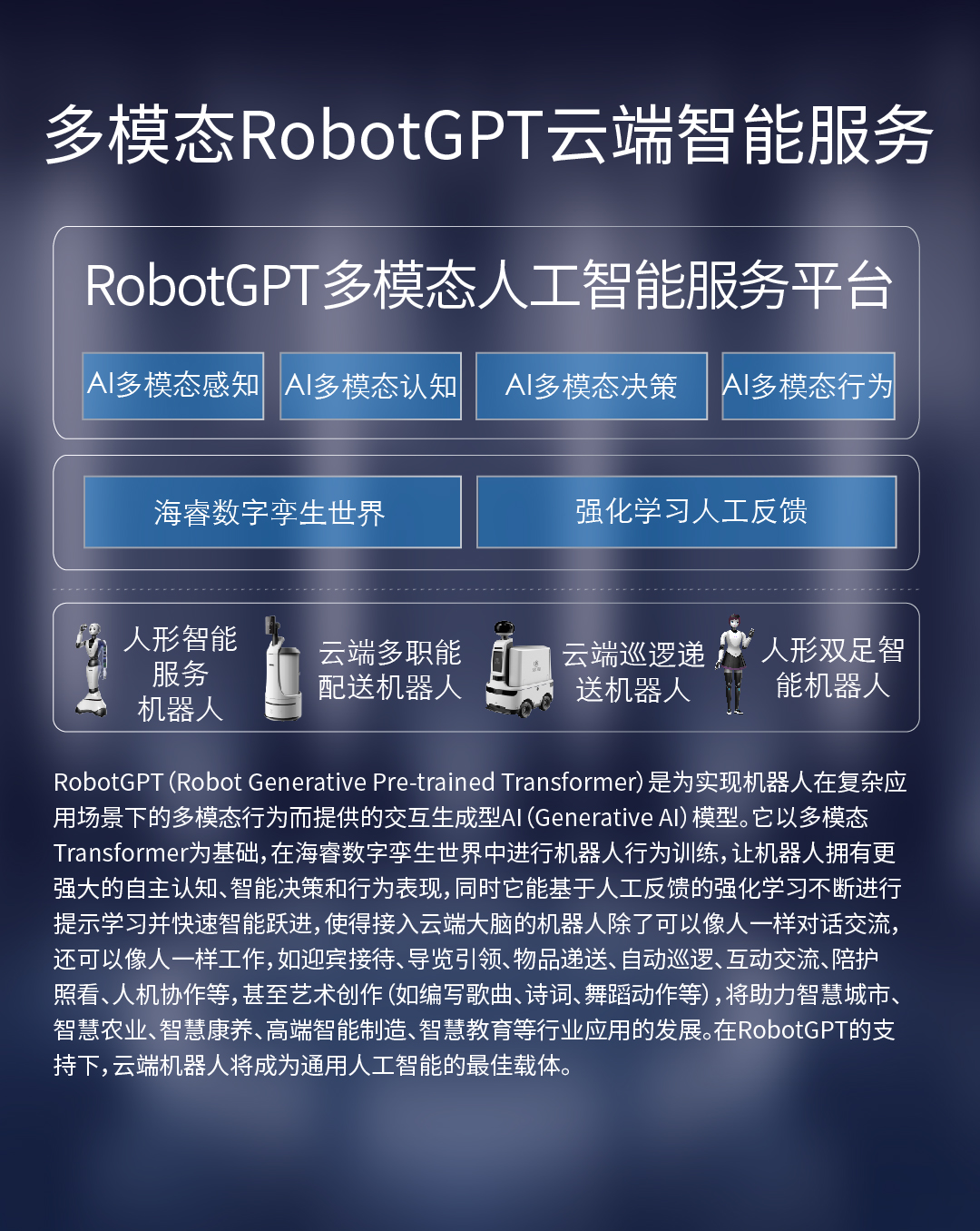 RobotGPT(Robot Generative Pre-trained Transformer)是為實(shí)現(xiàn)機(jī)器人在復(fù)雜應(yīng)用場(chǎng)景下的多模態(tài)行為而提供的交互