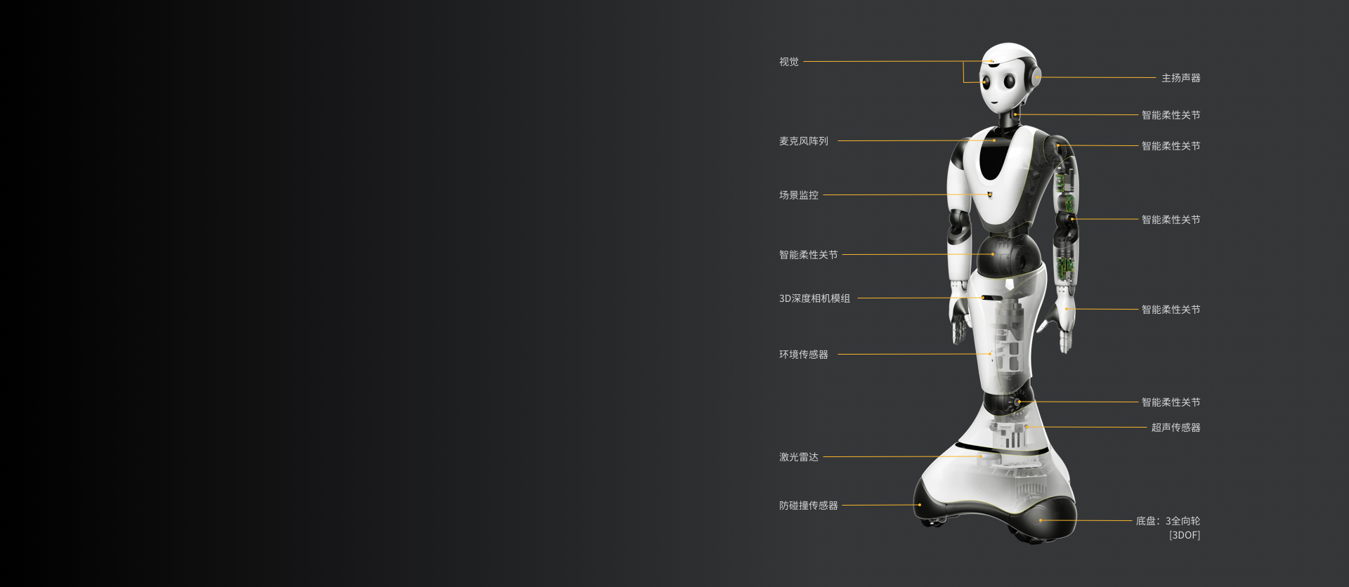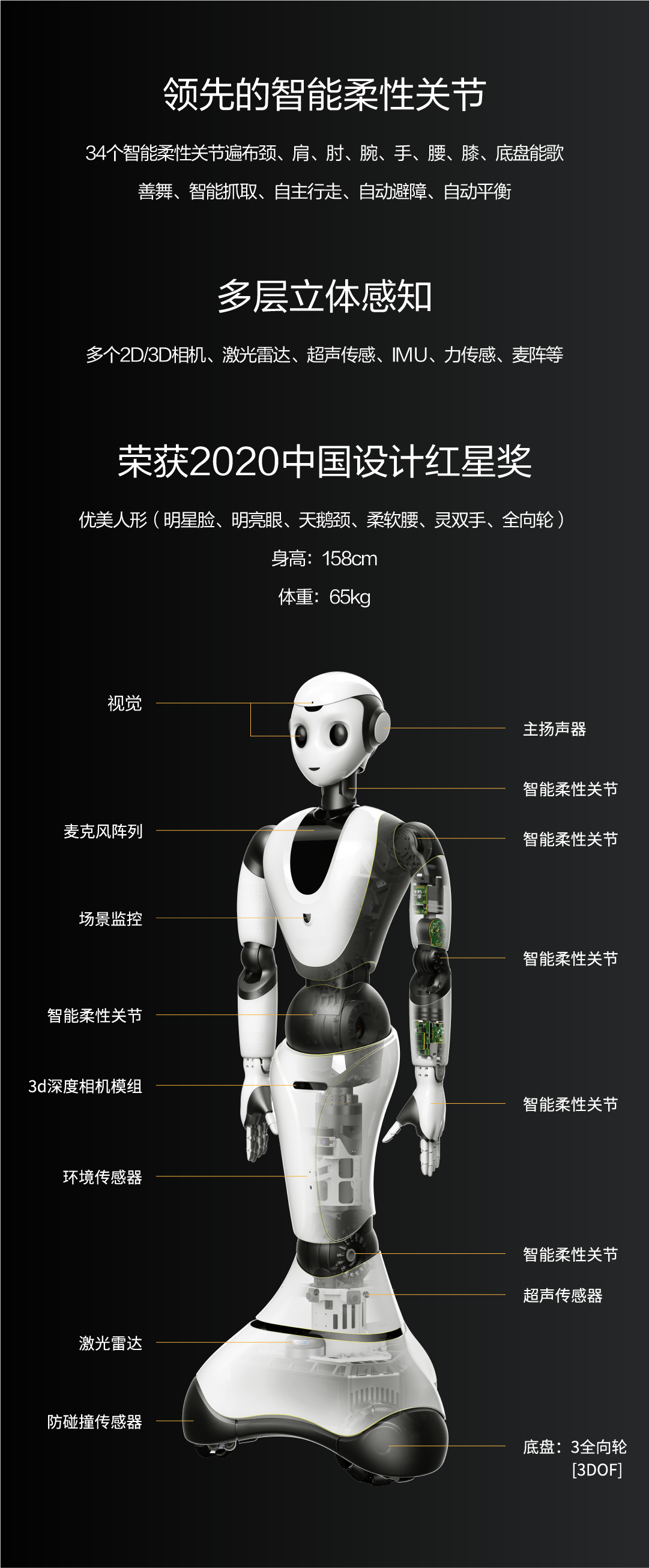 34個智能柔性關(guān)節(jié)遍布頸、肩、肘、腕、手、腰、膝、底盤