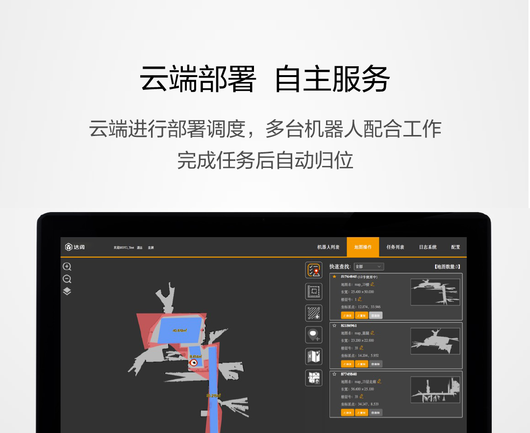 云端進行部署調度,多臺機器人配合工作,完成任務后自動歸位。