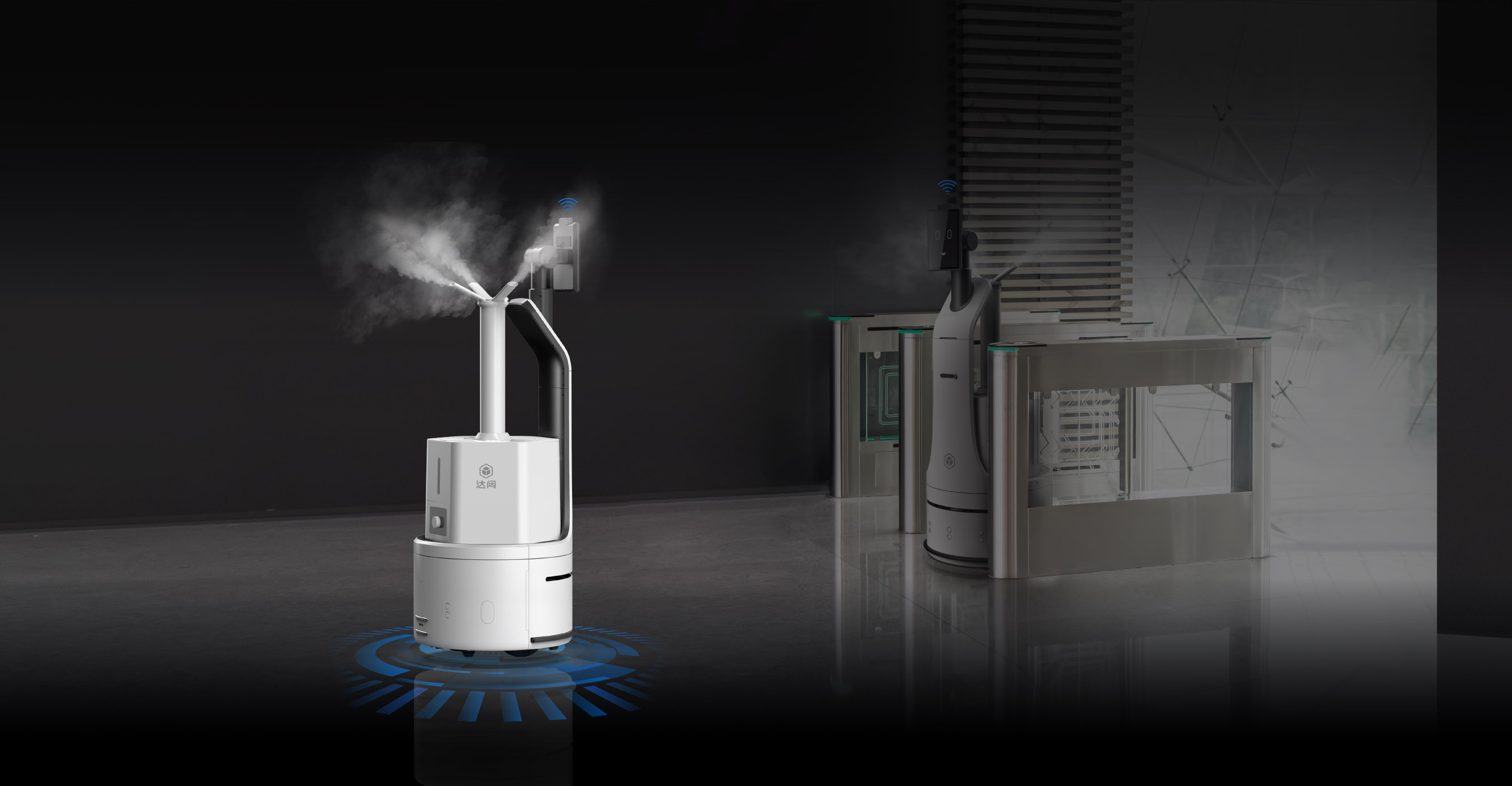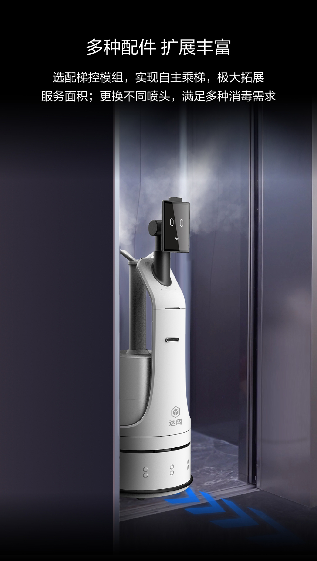 選配閘機(jī)、梯控模組,實(shí)現(xiàn)自主過閘機(jī)、自主乘梯等功能,極大拓展服務(wù)面積;更可更換不同霧化噴頭,滿足多樣消毒需求