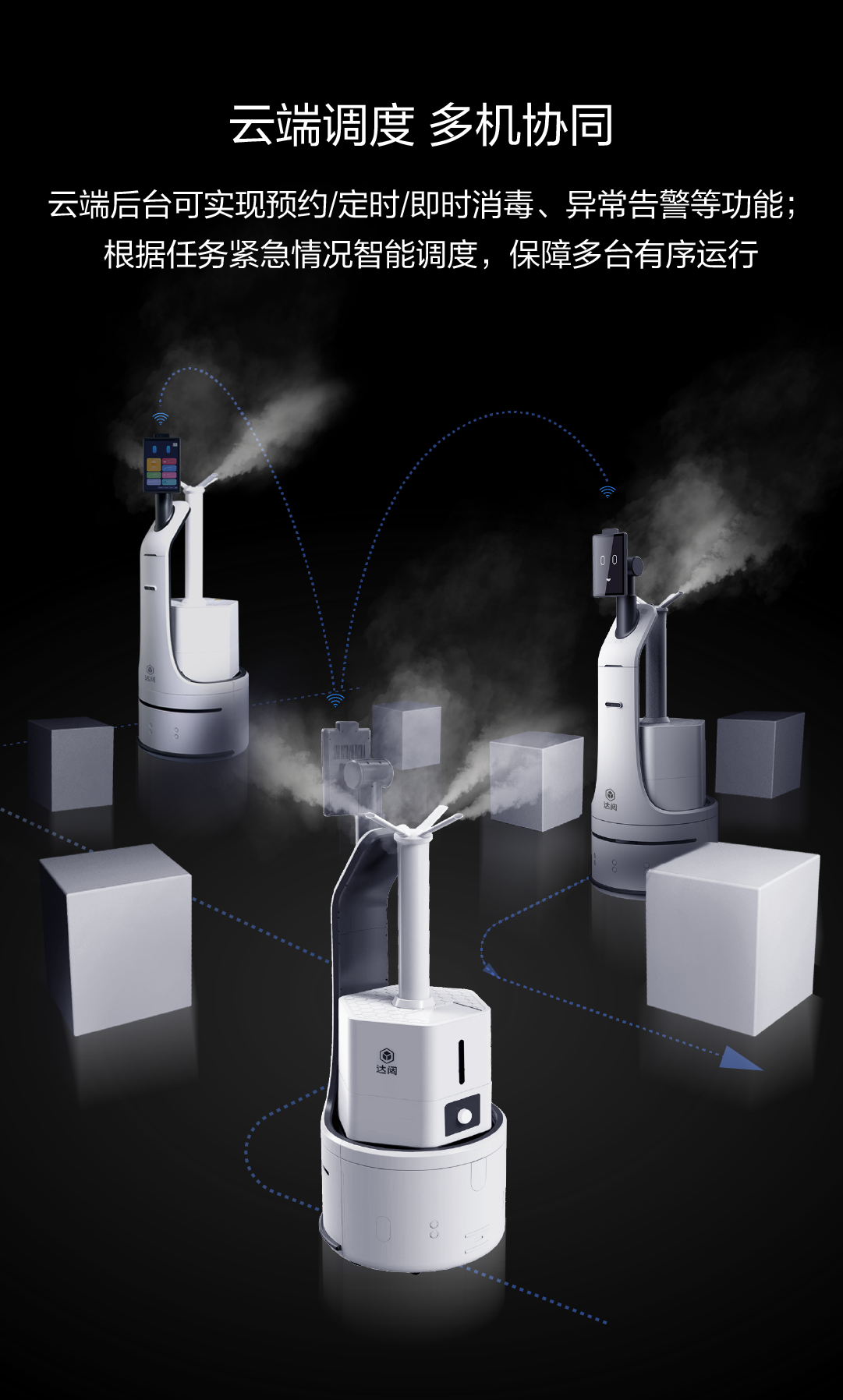 云端后臺(tái)可實(shí)現(xiàn)預(yù)約/定時(shí)/即時(shí)消毒、異常告警等功能;根據(jù)任務(wù)緊急情況智能調(diào)度,保障多臺(tái)有序運(yùn)行